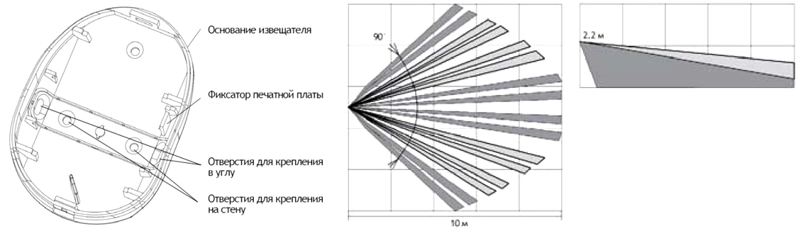 Зону обнаружения могут ограничивать непрозрачные предметы (шторы, комнатные растения, шкафы, стеллажи), а также стеклянные и сетчатые перегородки. В поле зрения датчика по возможности не должно быть окон, кондиционеров, нагревателей, батарей отопления. Наличие в зоне обнаружения предметов мебели, на которые может взобраться животное, может привести к ложной тревоге.