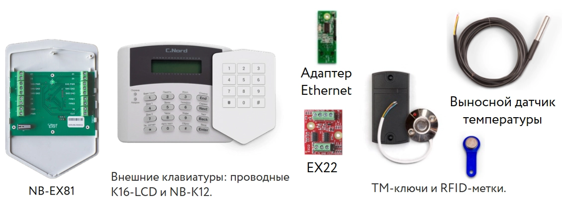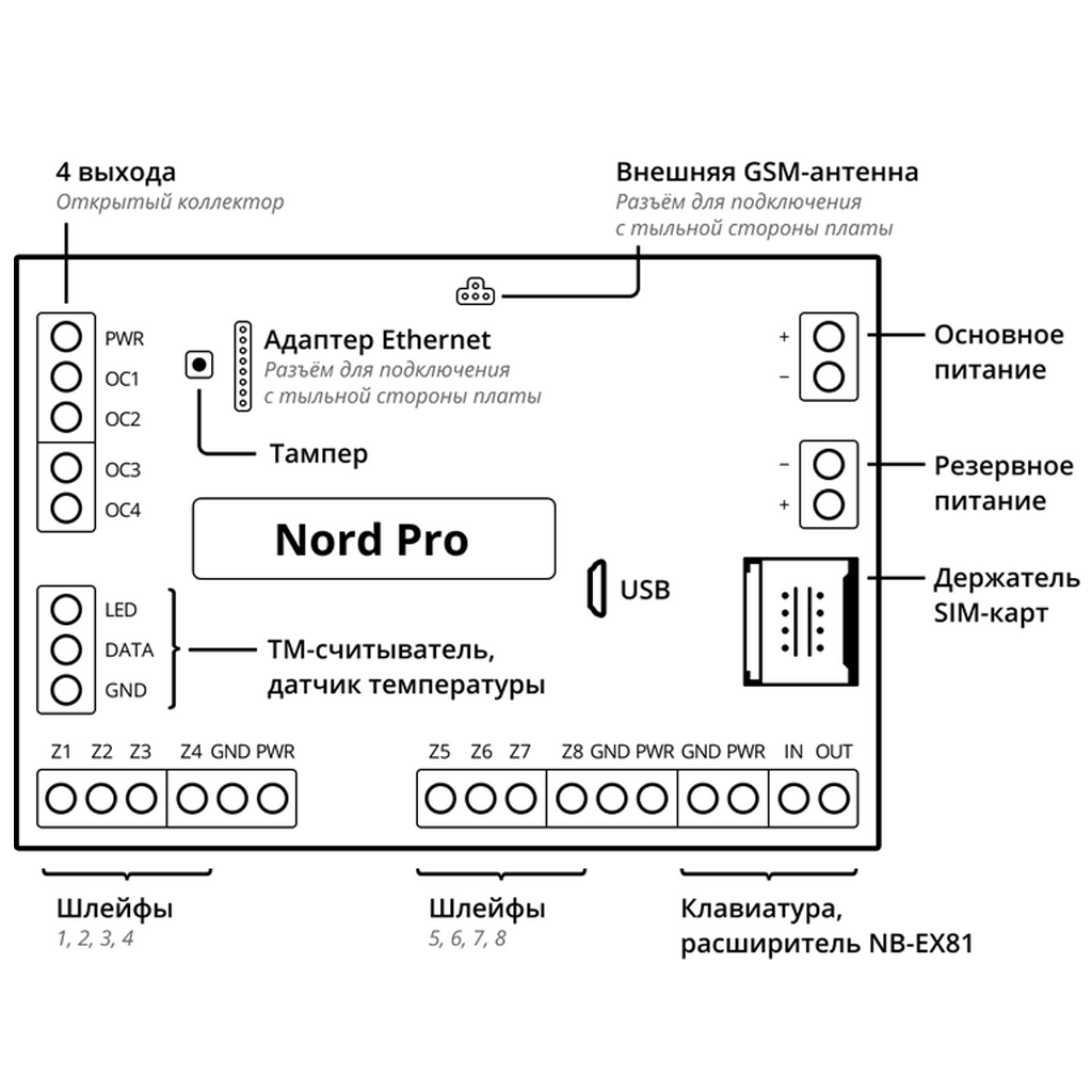 - С помощью расширителя NB-EX81 количество проводных шлейфов Nord Pro можно увеличить с 8 до 48.