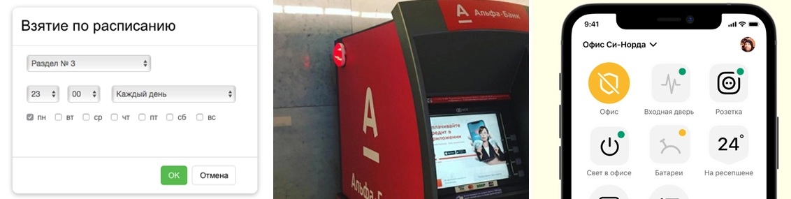 Взятие по расписаниюНапример, клиент хочет, чтобы все офисные помещения автоматически брались под охрану в 21:00. Инженер настраивает расписание удалённо, через конфигуратор Хаббл.