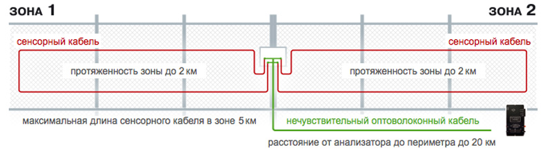 Сами анализаторы могут быть установлены при этом в контрольном центре на расстоянии до 20 км от охраняемой зоны, подключение сенсорного кабеля производится посредством стандартного одномодового оптоволокна.