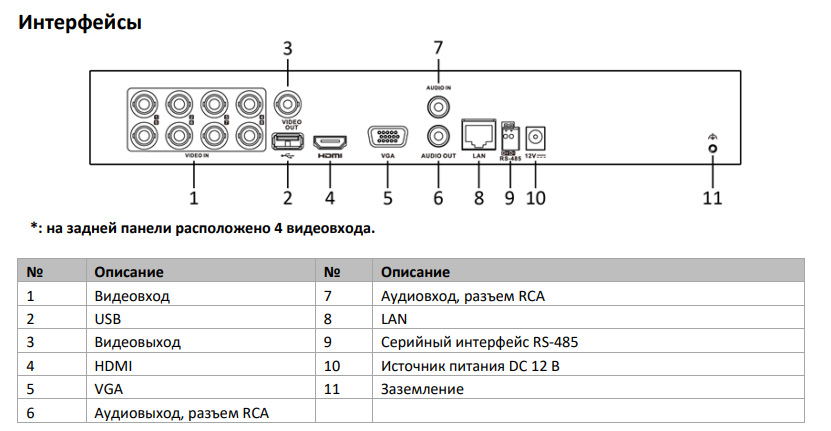 *** количество аудиовходов и тревожных входов / выходов указано для справки. На этикетке приведены параметры аудиовходов и тревожных входов / выходов. Например, «4A + 8 / 4ALM» означает, что устройство имеет 4 аудиовхода, 8 тревожных входов и 4 тревожных выхода. Если устройство имеет только 1 аудиовход, описание может не быть указано на этикетке.