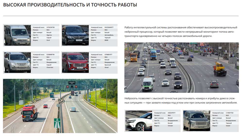 Работу интеллектуальной системы распознавания обеспечивает высокопроизводительный нейронный процессор, который позволяет вести непрерывный мониторинг потока автотранспорта одновременно на четырех полосах автомобильной дороги.