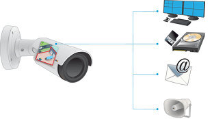 Это приложение интегрируется с системой управления камеры, которая в ответ на сигнал тревоги отправляет уведомления по электронной почте, направляет поток видео в систему ПО для управления видео, записывает видео на карту памяти и запускает внешние устройства через выходные порты камеры.