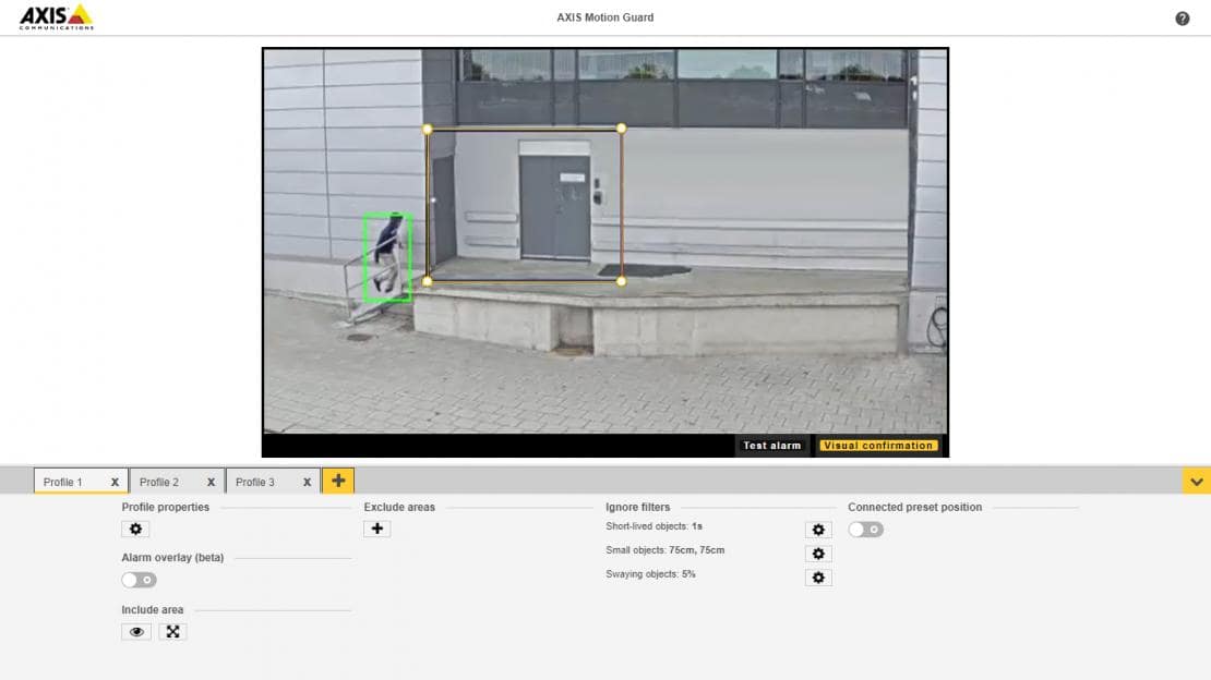 AXIS Video Motion Detection 4 запускается при наличии движущихся объектов, в том числе людей и автомобилей, в заранее определенных вами зонах. Его можно настроить для инициирования оповещений при обнаружении движения в нескольких заранее определенных областях включения.Поддержка нескольких профилей