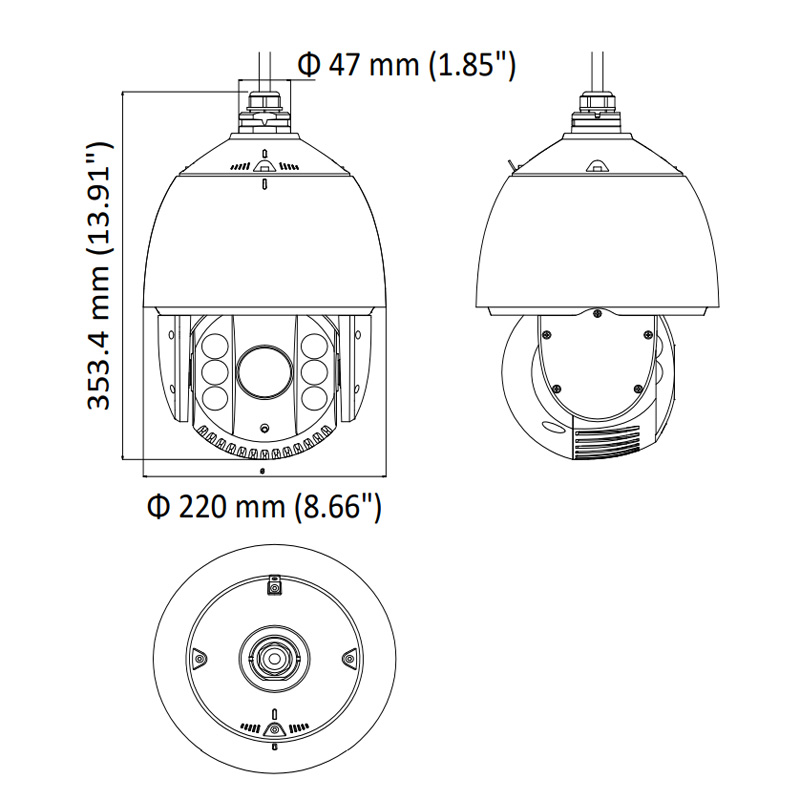 • Стандарт: IP66 (купольная камера, установка снаружи помещений), TVS 4,000 В грозозащита, защита от импульсных и переходных перенапряжений/ IK10 (кроме стеклянных деталей)