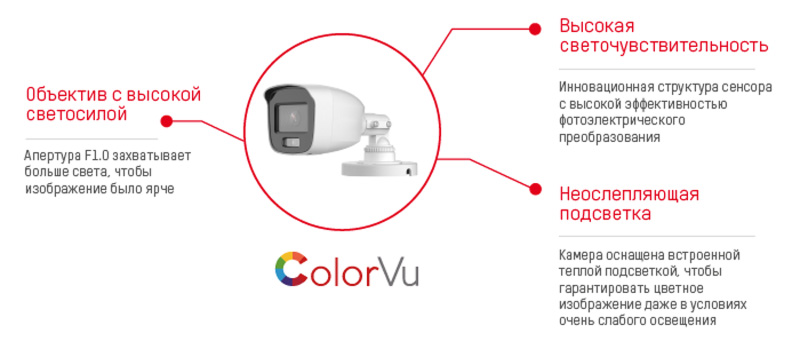 Главная особенность камер с применением этой технологии в том, что при минимальном освещении, или при его полном отсутствии, формируется цветное изображение. Этим камеры отличаются от большинства других моделей, которые в темноте формируют черно-белое изображение с помощью ИК-подсветки. В камерах ColorVu вместо ИК-подсветки используется мягкая и неослепляющая LED-подсветка, которая и формирует цветное изображение. Исходные цвета объектов не искажаются. В камерах работает автоматически настраивающийся алгоритм трехмерного шумоподавления, за работу которого отвечает независимый процессор ISP.