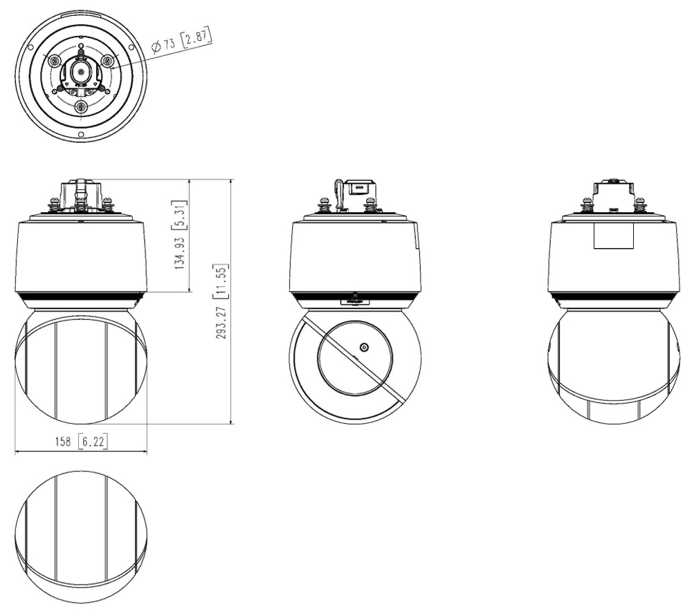 Камера имеет размеры Ø158.0 x 293.3 мм и весит 3,1 кг. Ее корпус белого цвета соответствует стандартам защиты IP66, IK10, NEMA4X, что гарантирует защиту от пыли, воды, взлома и повреждений.