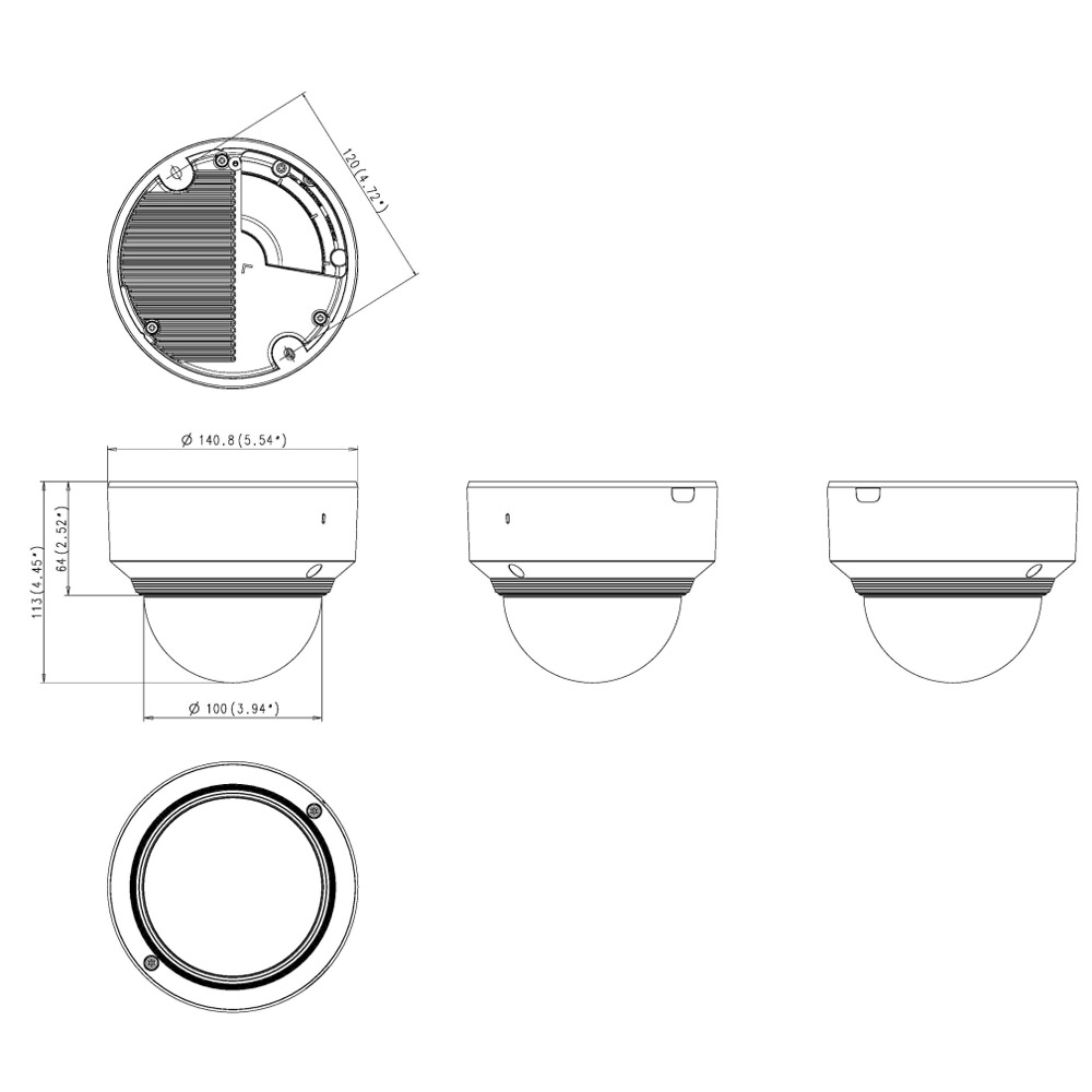 Камера питается через PoE (IEEE802.3af, Class3) и имеет максимальное энергопотребление 8 Вт. Рабочая температура составляет от -10°C до +55°C. Камера имеет диаметр 140.8 мм и высоту 113 мм, весит 690 грамм и имеет степень защиты алюминиевого корпуса IK08.