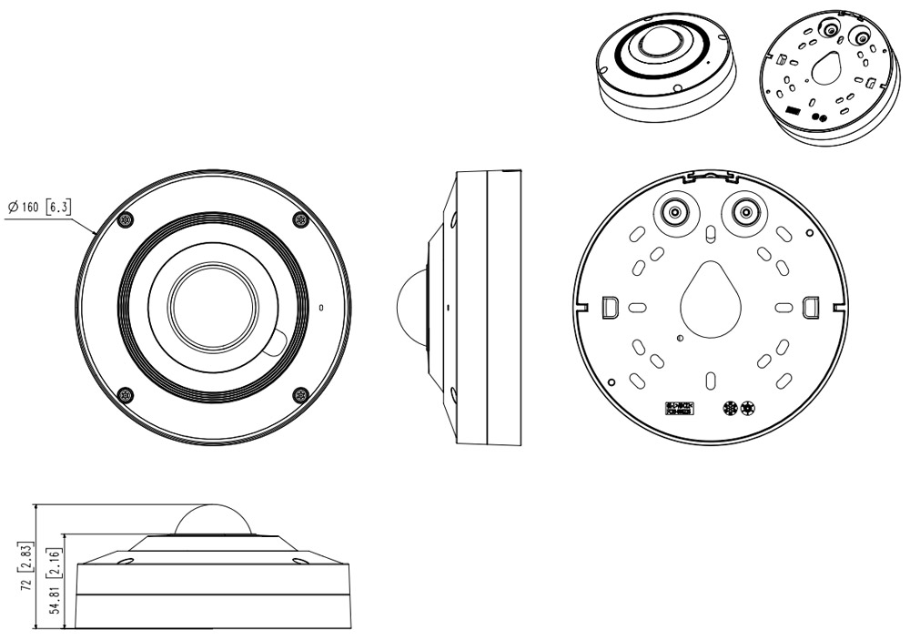 Она оснащена 1/2.3" CMOS матрицей с разрешением 12 МП и имеет встроенный Fisheye объектив с фиксированным фокусным расстоянием 1.08 мм, который обеспечивает панорамный обзор в 187°, и ИК подсветку белого цвета дальностью до 10 м.