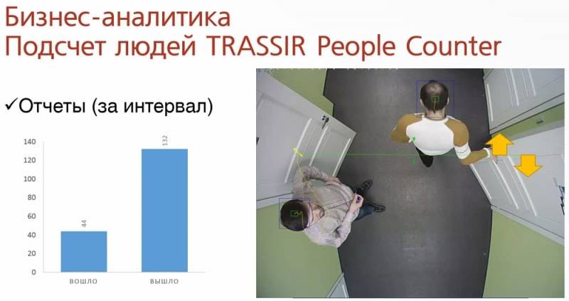 • Модуль подсчета посетителей проходящих через заданную границу, работает только при ракурсе "вид сверху". Анализ активности посетителей по отчетам за произвольный интервал времени. Cтоимость обработки 1-го канала видео.