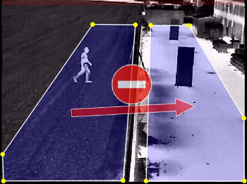 • Пересечение зоны: регистрируется, если человек или автомобиль пересекает две заранее определенные зоны в заданной последовательности и двигаясь в заданном направлении.