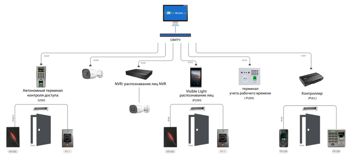 Модуль видеонаблюдения поддерживает подключение как камер ZKTeco по протоколу производителя, так и стандартных камер по протоколу Onvif. Также поддерживаются видеорегистраторы: ZKTeco NVR and IPC.