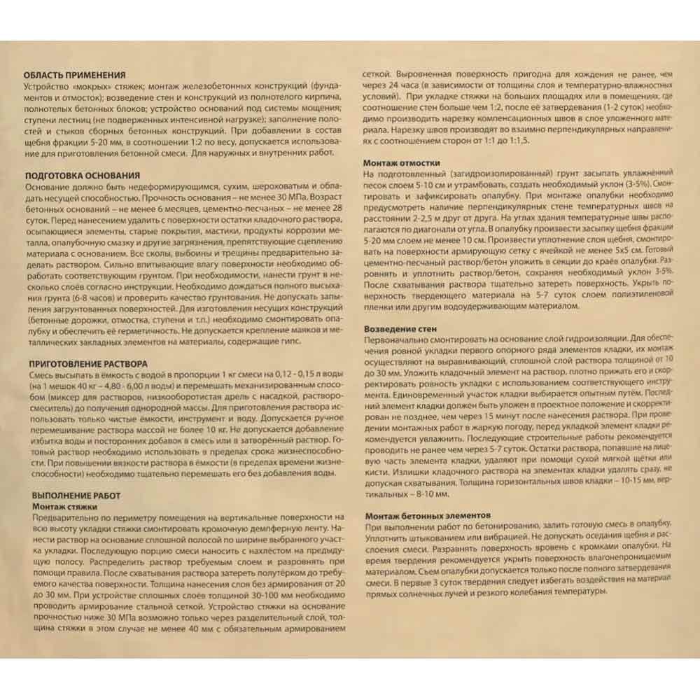 Устройство «мокрых» стяжек; монтаж железобетонных конструкций (фундаментов и отмосток); возведение стен и конструкций из полнотелого кирпича, полнотелых бетонных блоков; устройство оснований под системы мощения; ступени лестниц (не подверженных интенсивной нагрузке); заполнение полостей и стыков сборных бетонных конструкций. При добавлении в состав щебня фракции 5-20 мм, в соотношении 1:2 по весу, допускается использование для приготовления бетонной смеси. Для наружных и внутренних работ.