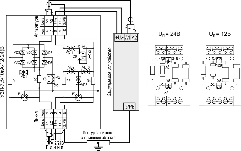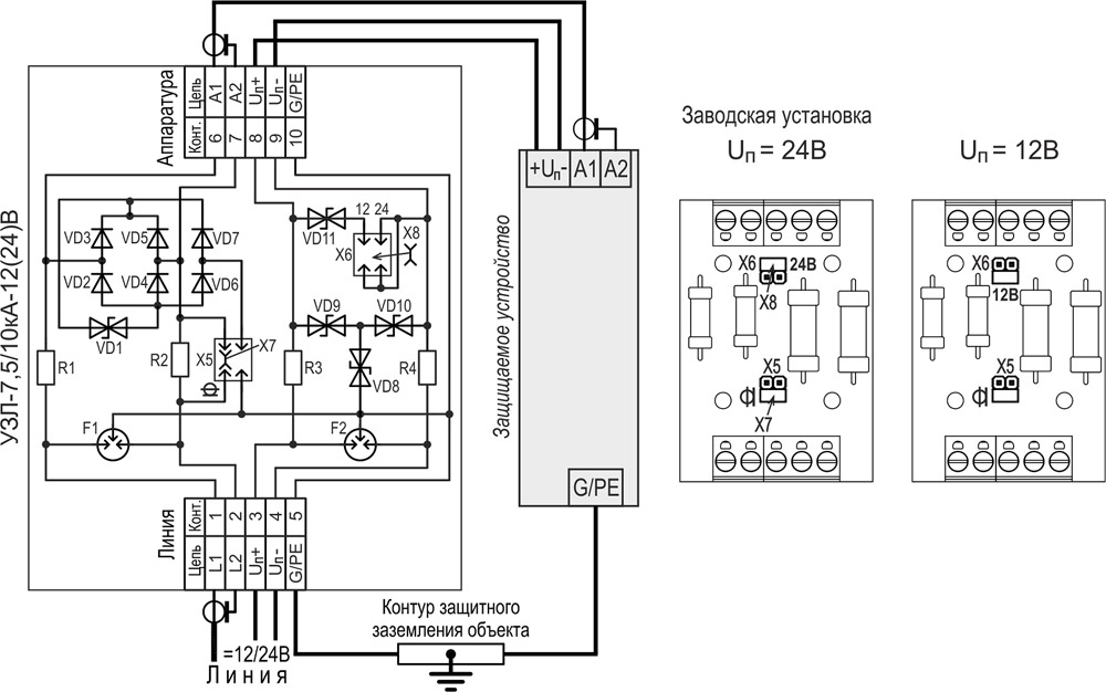 Устройство защиты УЗЛ-7,5/10кА-12/24В предназначено для защиты сигнальных цепей и цепей питания аппаратуры приёма и передачи видеосигнала, работающей по протяженным симметричным и несимметричным линиям от импульсных перенапряжений и помех, вызванных электромагнитными импульсами высоких энергий (грозовыми разрядами, коммутационными помехами и др.) в пределах 1а (в) -2 зон молниезащиты (в соответствии с МЭК 61312-1).