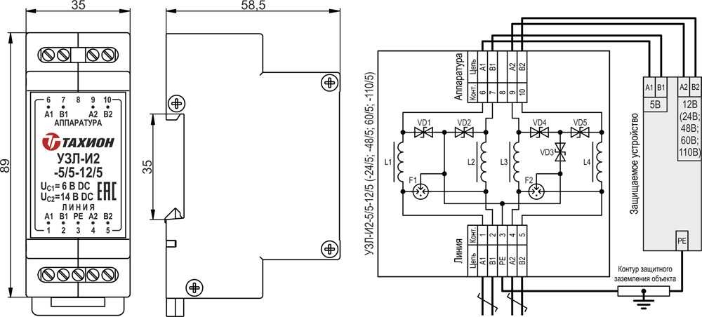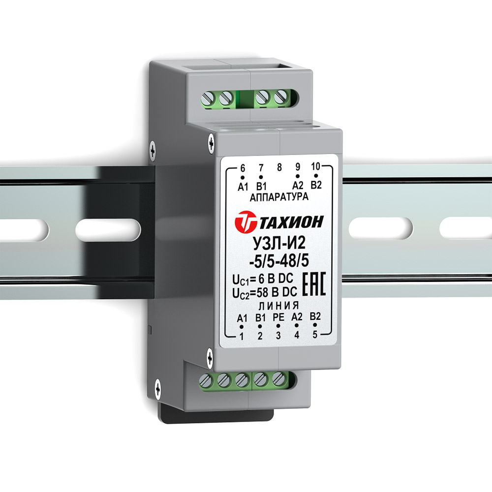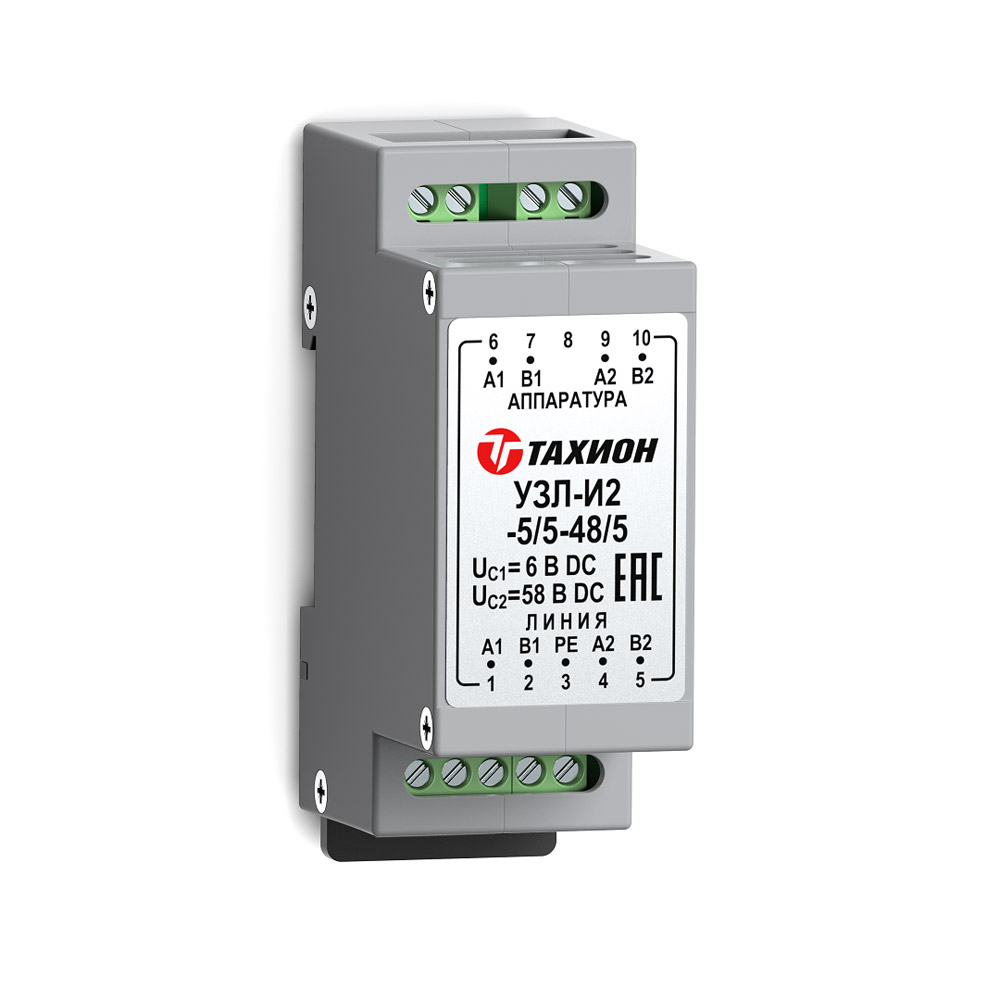 Устройство защиты интерфейсов с подачей питания УЗЛ-И2-5/5-48/5 с двумя каналами предназначено для защиты от импульсных перенапряжений (грозовых, электростатических разрядов и др.) оборудования промышленной автоматизации, диспетчеризации, систем безопасности, использующих 2х проводные линии интерфейса RS-485, RS-422, M-bus, CAN и их разновидностей, в пределах 2-3 зон молниезащиты (в соответствии с МЭК 61312-1). Устройство обеспечивает защиту интерфейса и передачу питания 5 В DC по каналу А1 В1 и 48 В DC по каналу А2 В2 по сигнальным парам с величиной тока до 5 А.