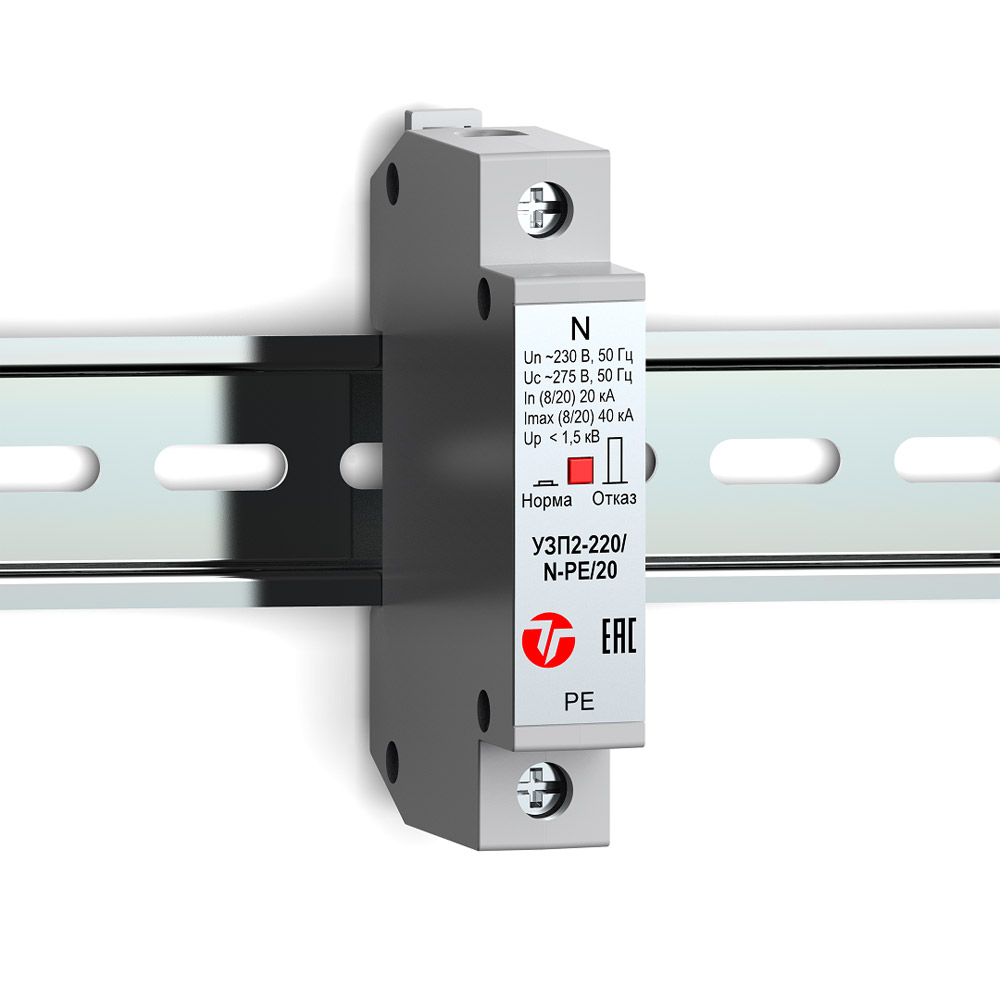 УЗП2-220/N-PE/20 – однополюсное устройство защиты ограничительного типа класса испытаний II, по техническим и эксплуатационным характеристикам удовлетворяющее требованиям ГОСТ IEC 61643-11, ГОСТ 30011.1, ГОСТ Р 50571-4-44, ГОСТ Р 50571.5.53.