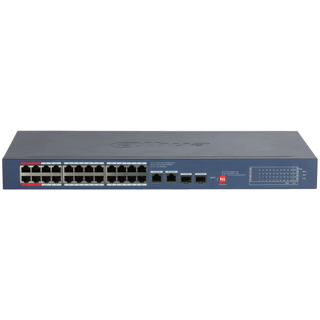 - 28-портовый коммутатор: 24 × RJ-45 PoE + 2 × RJ-45 uplink + 2 × SFP uplink.