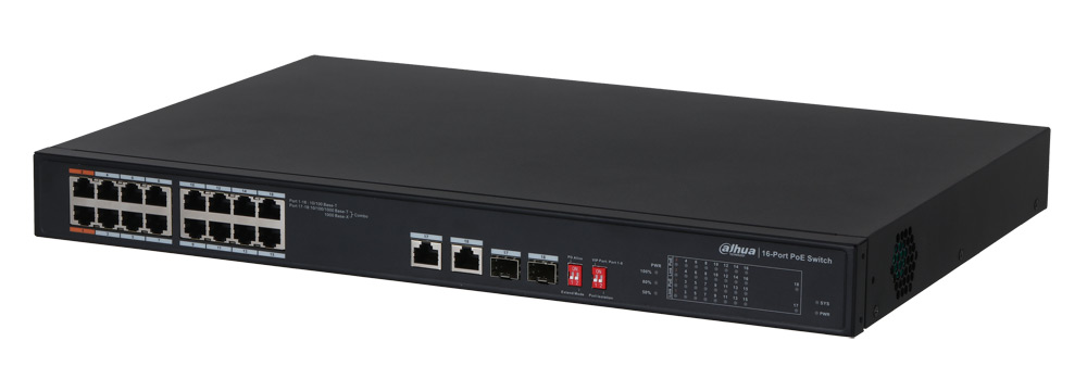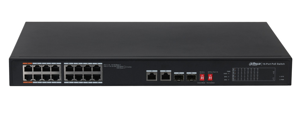 PFS3218-16ET-135 – 100-мегабитный неуправляемый коммутатор с 2 комбо-портами uplink и поддержкой подачи питания PoE. В нем используются DIP-переключатели для включения функций изоляции портов, увеличенной дальности PoE, сторожевого таймера PoE и QoS. Для передачи на большие расстояния предусмотрены гигабитные оптические порты. Ориентирован на применение в небольших системах видеонаблюдения для офисов, школ, гостиниц, супермаркетов, больниц и т.п.