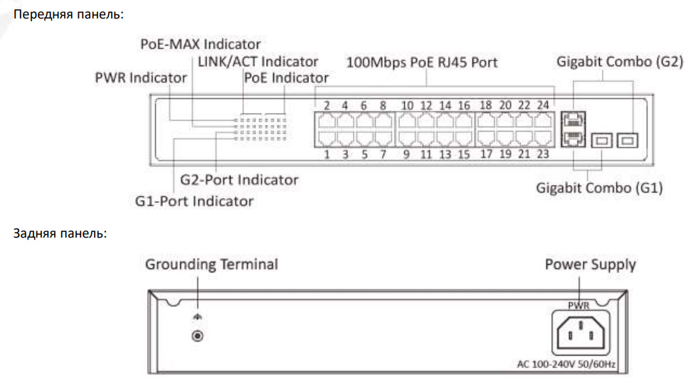 • Количество портов: 24 × 100 Мбит/с PoE RJ45, 2 × Gigabit комбинированных порта