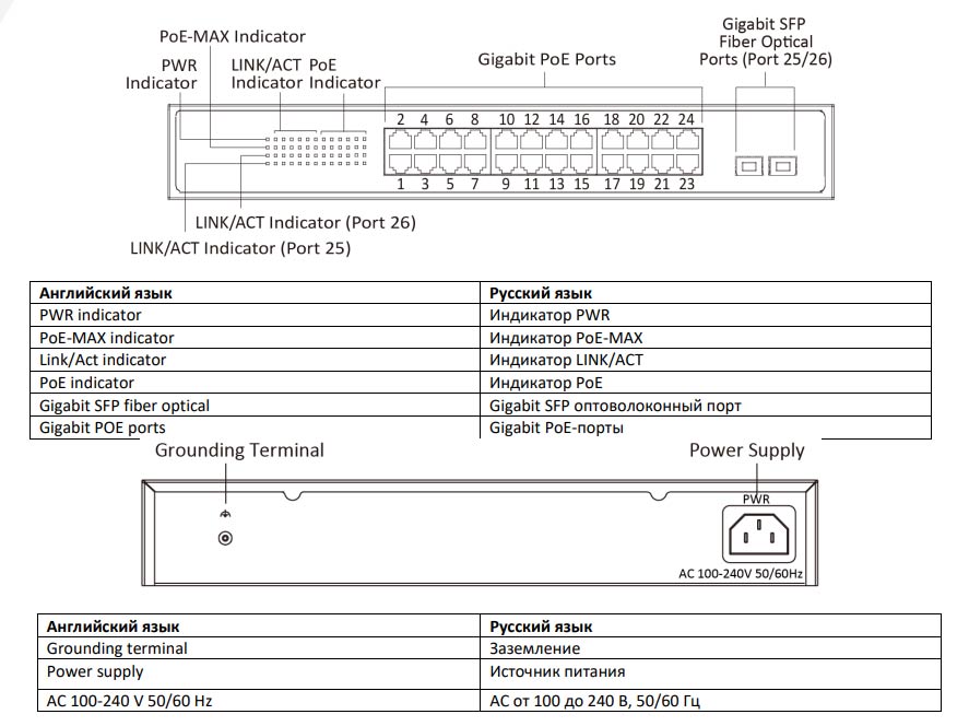 • 24 Gigabit PoE-порта, 2 × Gigabit-оптоволоконных порта.
