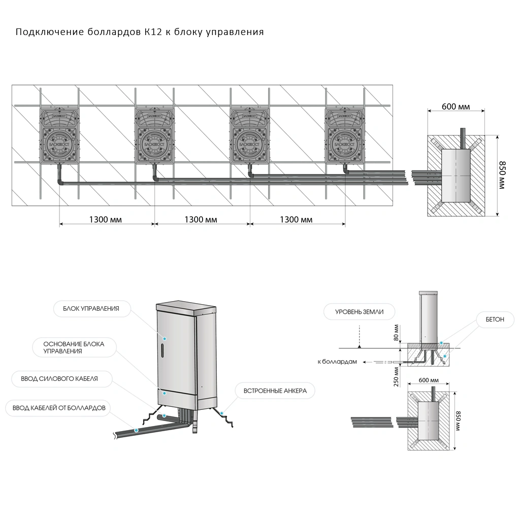 - 550х300х1250 мм: для 2 групп (6+6 боллардов) либо 1 группы (12 боллардов)