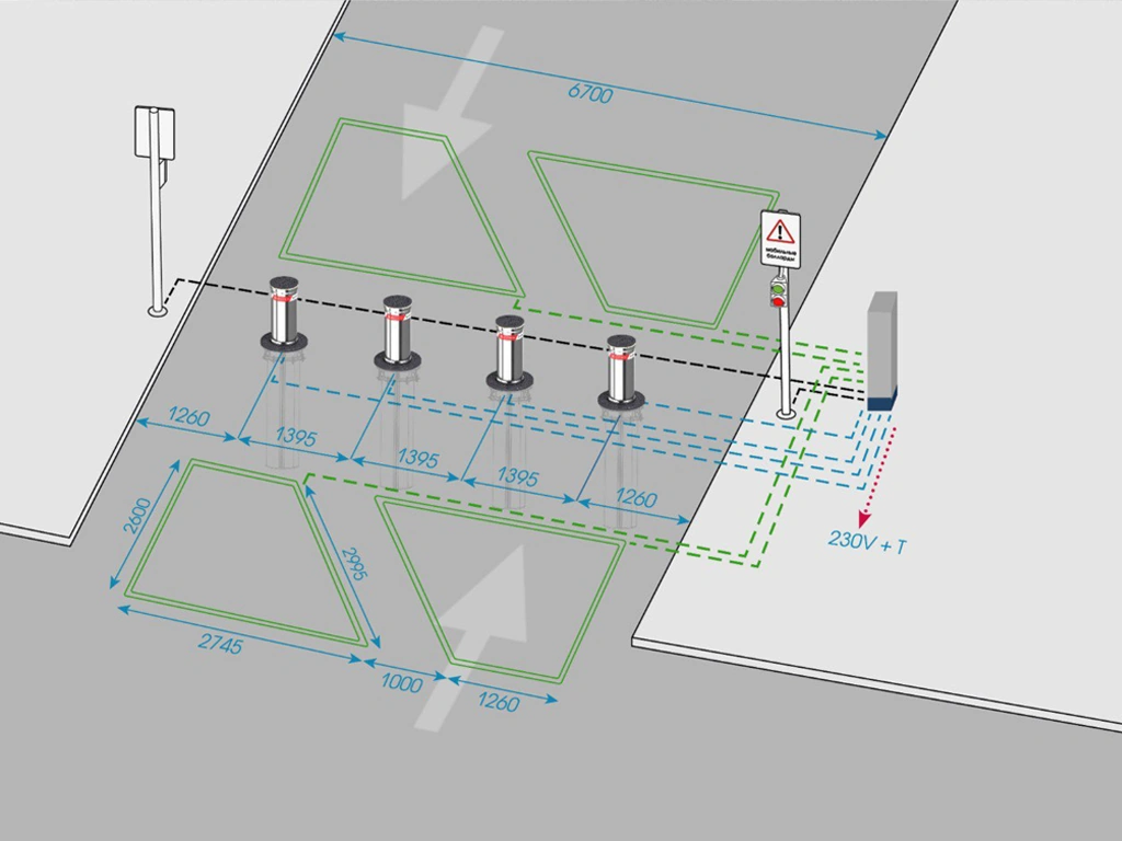 Система управления имеет степень защиты IP55 и поддерживает управление как по проводным, так и по беспроводным каналам. Блок управления позволяет подключать до 18 боллардов, обеспечивая централизованный контроль. Механизм болларда рассчитан на не менее чем 300 000 циклов, что делает данное решение оптимальным для объектов с высокой интенсивностью проезда — контрольно-пропускных пунктов, промышленных территорий, транспортных терминалов и военных объектов.