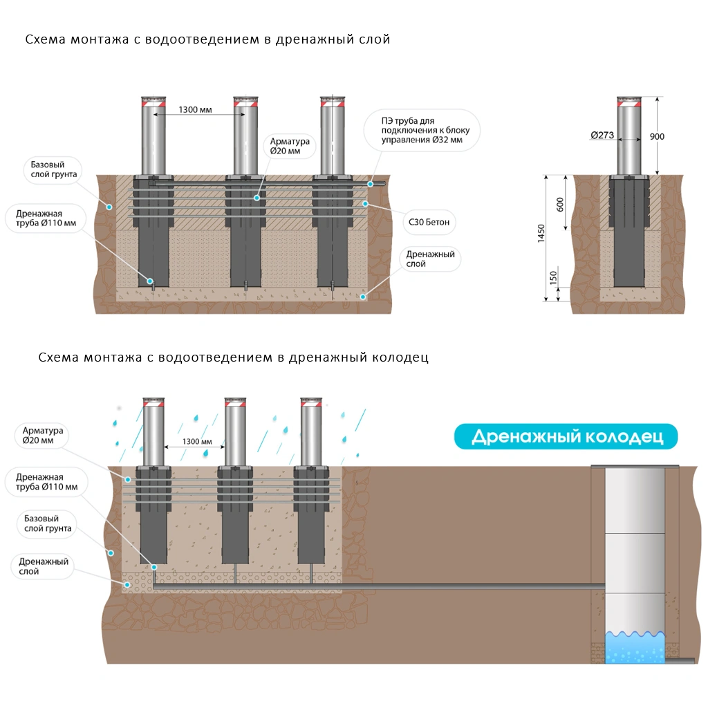 - 550х300х900 мм: для 1 независимой группы 6 боллардов