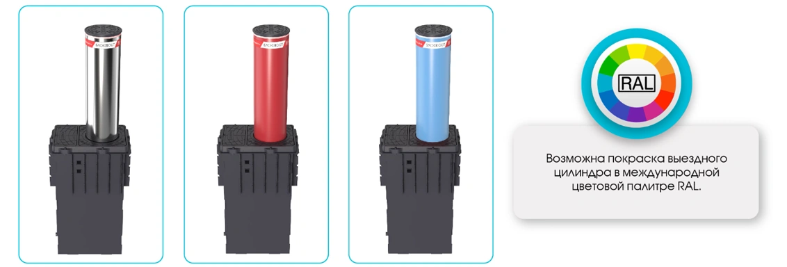 Безопасность и дизайн — подсветка выдвинутого столба и светоотражающая полоса. Возможность выбора цвета блокиратора по палитре RAL.