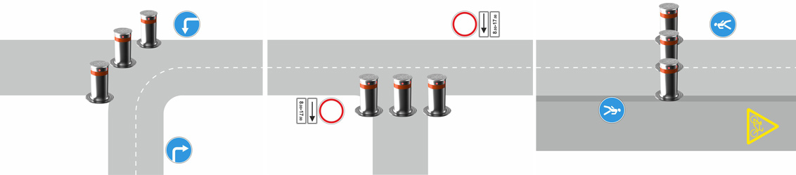 - Безопасное и быстрое срабатывание — подъём/опускание 15/30 см в секунду. Подсветка и отражатели на поверхности делают боллард заметным на дороге.