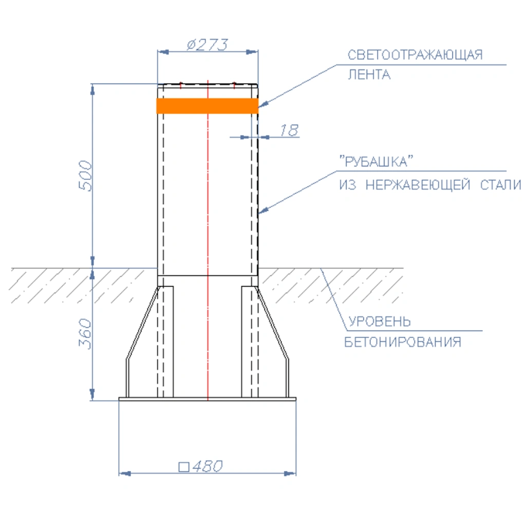 Корпус болларда выполнен из толстостенной трубы диаметром 273 мм с нержавеющей «рубашкой» и усиленным фланцем. За счет толщины стенки 18 мм конструкция выдерживает значительные ударные нагрузки. Высота надземной части — 500 мм, что обеспечивает оптимальное соотношение видимости и защитных свойств. На верхней части установлена светоотражающая полоса, повышающая видимость ограждения в темное время суток. Конструкция устойчива к механическим воздействиям, коррозии и экстремальным температурам, что гарантирует длительный срок службы даже в условиях интенсивной эксплуатации.