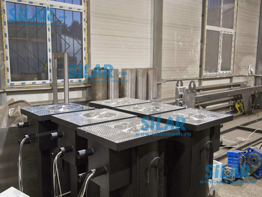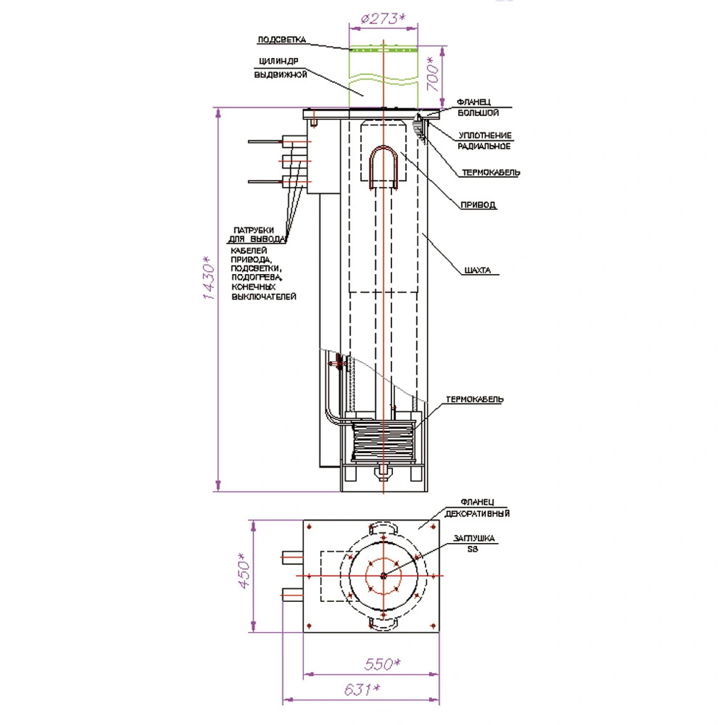 Шахта представляет собой трубу с приваренными к ней фланцем, ручками для переноса и втулками для крепления большого фланца. На боковой стороне трубы расположен карман с патрубками Ø48 мм для вывода кабелей привода, подсветки и подогрева. В нижней части шахты приварено дно с отверстием для крепления актуатора, дренажными отверстиями и пазами для упоров.