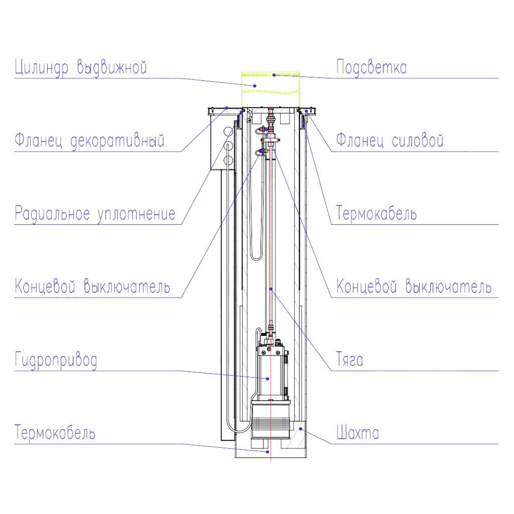 Гидропривод- включает в себя гидроцилиндр, совмещенный с гидростанцией. Гидроцилиндр - основной исполнительный механизм. К его штоку крепится тяга, которая ездит вверх и вниз вместе с выдвижным цилиндром, а концевые выключатели крепятся к неподвижному корпусу гидроцилиндра и срабатывают тягу в верхнем и нижнем положениях. Для поднятия столба в нижнюю полость гидроцилиндра подается гидравлическая жидкость под давлением. При пускании нижняя полость гидроцилиндра соединяется с баком, и столб движется вниз под собственным весом. Для подогрева столба на бак гидропривода намотан термокабель..