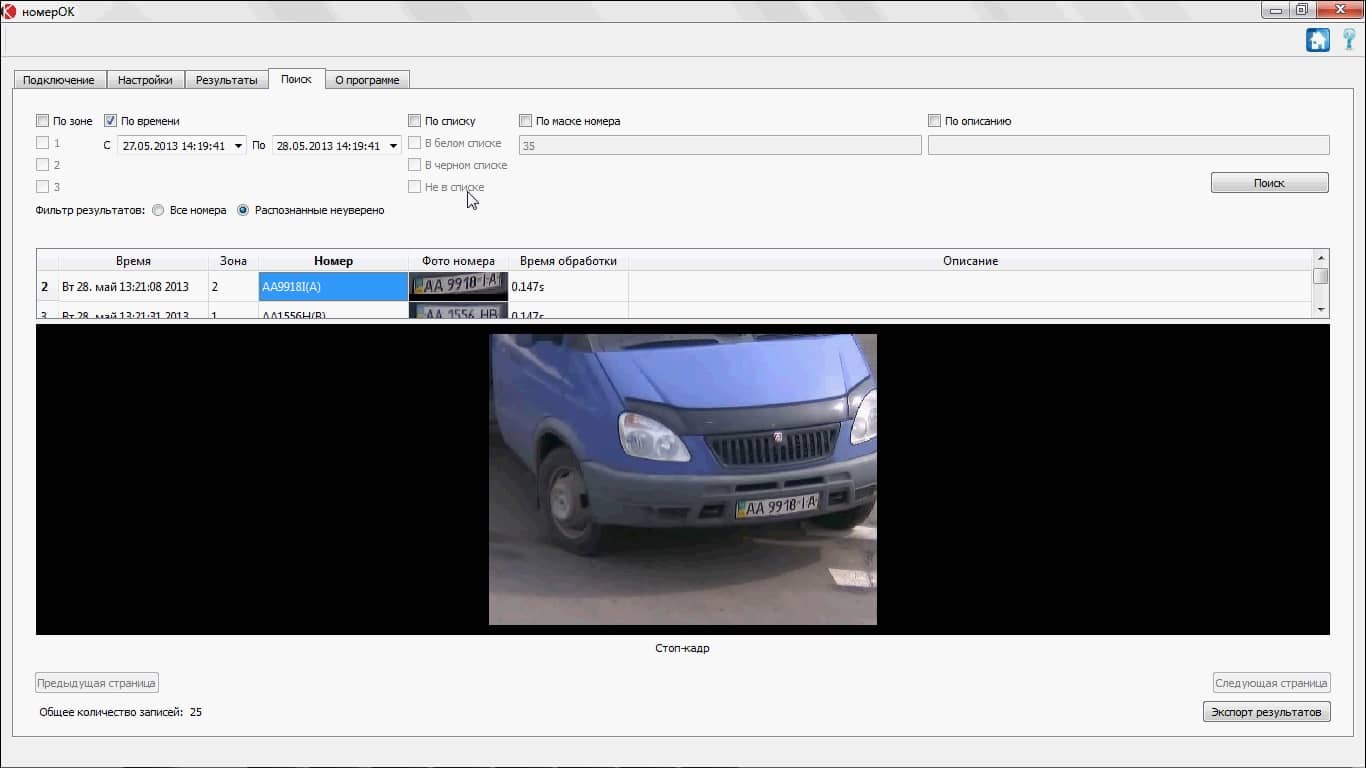 • Дата распознавания номера, марки, модели, типа и цвета машины