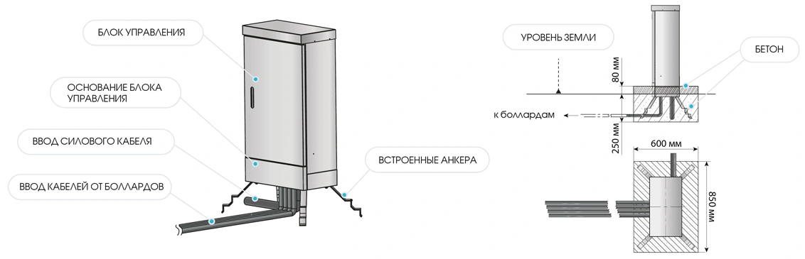 - Совместимость с функцией EFO (аварийный подъем). Для боллардов с поддержкой EFO шкаф дополнительно оснащается независимым проводным контроллером. Управление может быть сгруппировано — все болларды поднимаются как единая система.