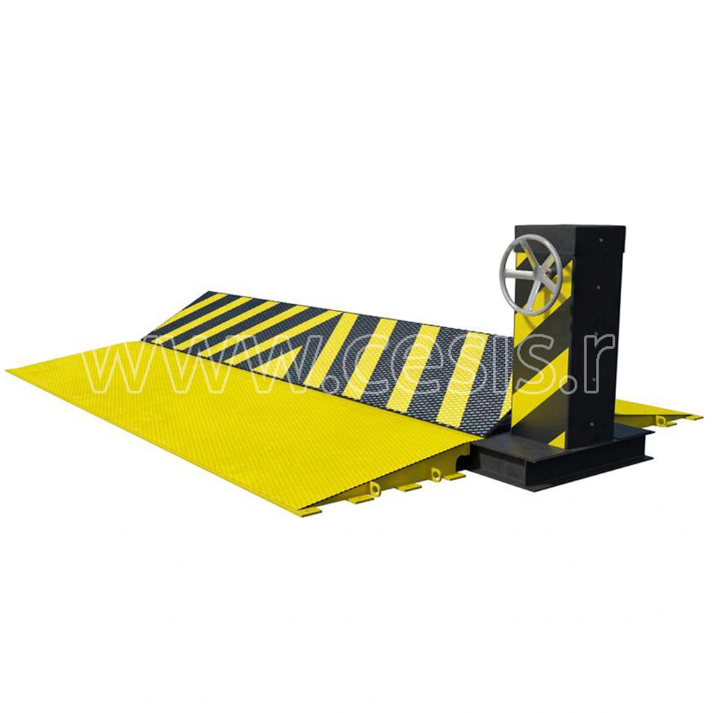 Дорожный блокиратор ЦеСИС ПРЕПОНА-П РЗ.1607.10.000 с аппарелями — это надёжное противотаранное устройство накладного типа с ручным приводом, предназначенное для ограничения движения автотранспорта и защиты охраняемых территорий. Конструкция представляет собой металлическую платформу, перемещающуюся в вертикальной плоскости с помощью механического штурвала, что позволяет вручную поднимать и опускать барьер в зависимости от ситуации. Устройство эффективно блокирует проезд и обеспечивает принудительную остановку транспортных средств, действуя как физический барьер против тарана.