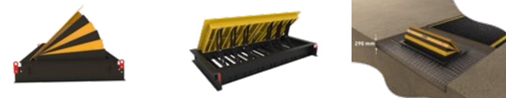 Скрытая конструкция шарнирного соединения без выпуклостей, расположенная ниже уровня земли, позволяет автотранспортным средствам проезжать плавно и бесшумно.