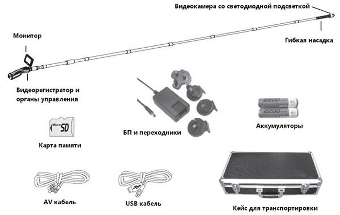 Видеодосмотровое устройство «RX-10» предназначено для визуального обследования скрытых и труднодоступных полостей автотранспорта, ж/д контейнеров, отсеков самолета и строительных конструкций, в процессе проведения мероприятий по выявлению взрывоопасных предметов, контрабанды, оружия или средств терроризма. ВДУ «RX-10» позволяет производить запись видео и фото на карту памяти.