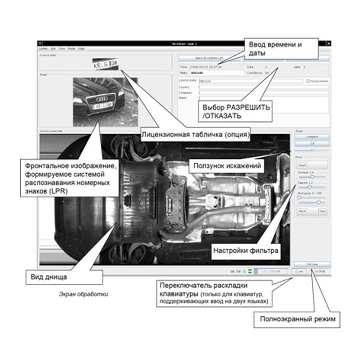 Для представления днища в корректном масштабе учитываются высота дорожного просвета и длина автомобиля. Днище выводится в режиме реального времени в виде изображения с высоким разрешением на контрольный монитор. Для упрощения сопряжения изображения днища с соответствующим автомобилем может опционально интегрироваться камера для записи фронтального изображения автомобиля, а также система определения номерных знаков.