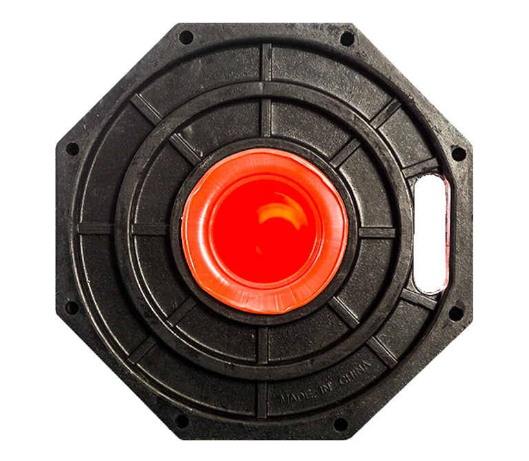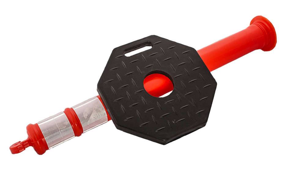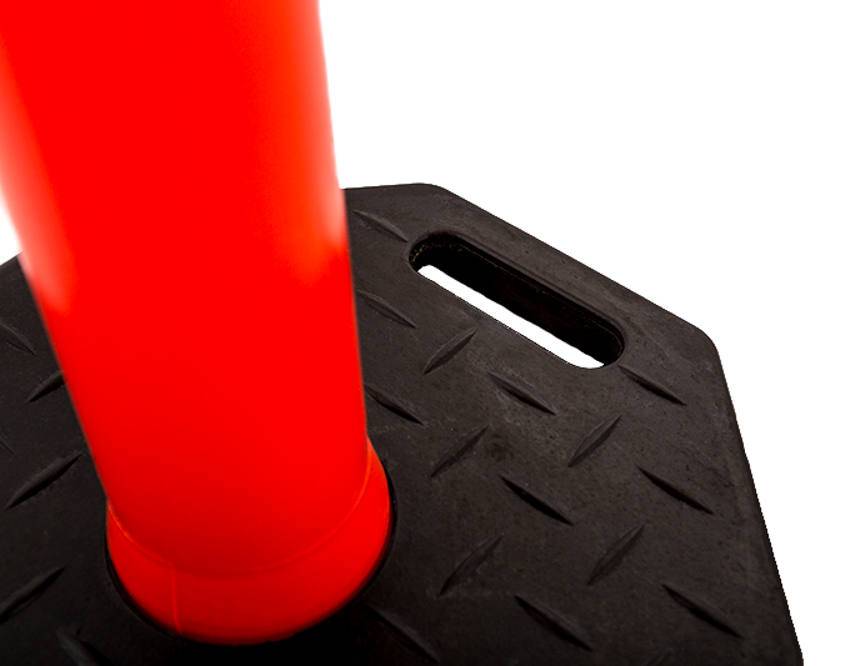 Столбик круглого сечения из красного пластика с нанесенной светоотражающей полосой белого цвета. В верхней части столба имеется крючок для переноса изделия, а также для присоединения цепи. Основа - резиновая подставка восьмигранной формы. Подставка надевается на изделие сверху и надежно фиксируется в нижней части. Подставка оснащена ручками для удобства переноса.