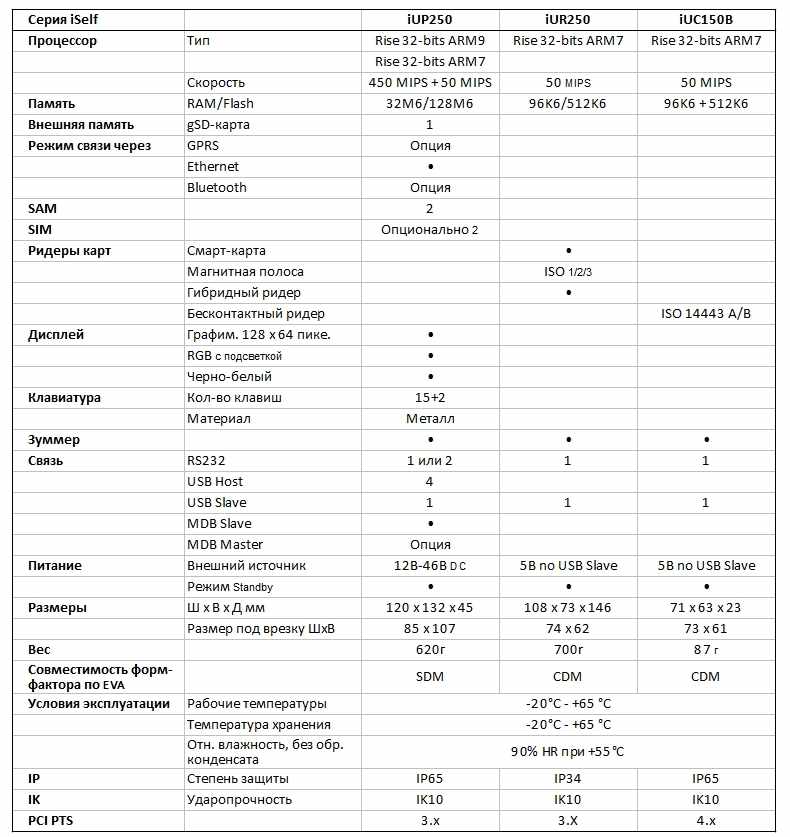 iUP250 и iUR250 сертифицированы PCI-PT5 3.x, a il)C150B - PCI-PTS 4.x, что говорит о высочайшем уровне надежности устройств как программноаппаратного комплекса. iUC150B обеспечивает защиту данных и надежность передачи информации. Конфигурации iSelf соответствуют модулям открытого протокола и SRED.