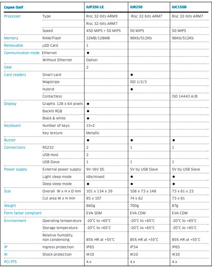 iUP25O, iUR250 и iUC150B сертифицированы PCI-PTS 4.x, что говорит о высочайшем уровне надежности устройств. iUC150B обеспечивает защиту данных и надежность передачи информации. Конфигурации iSelf соответствуют модулям открытого протокола и SRED.