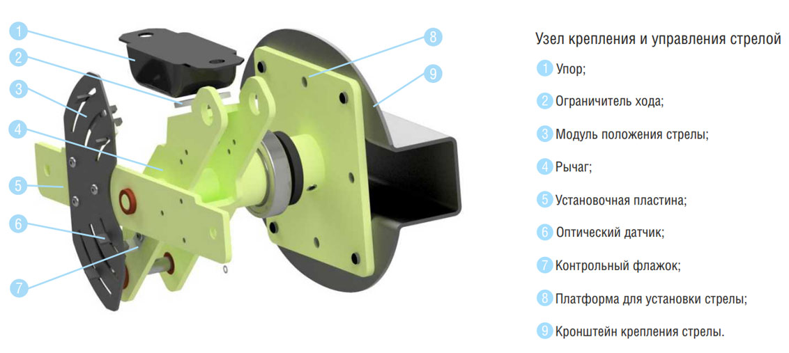 Система аварийного откидывания стрелы позволяет защитить внутренний механизм шлагбаума от повреждений в случаях попытки слома стрелы или таранного удара. Это достигается благодаря особой конструкции стрелодержателя с использованием полиамидных креплений.