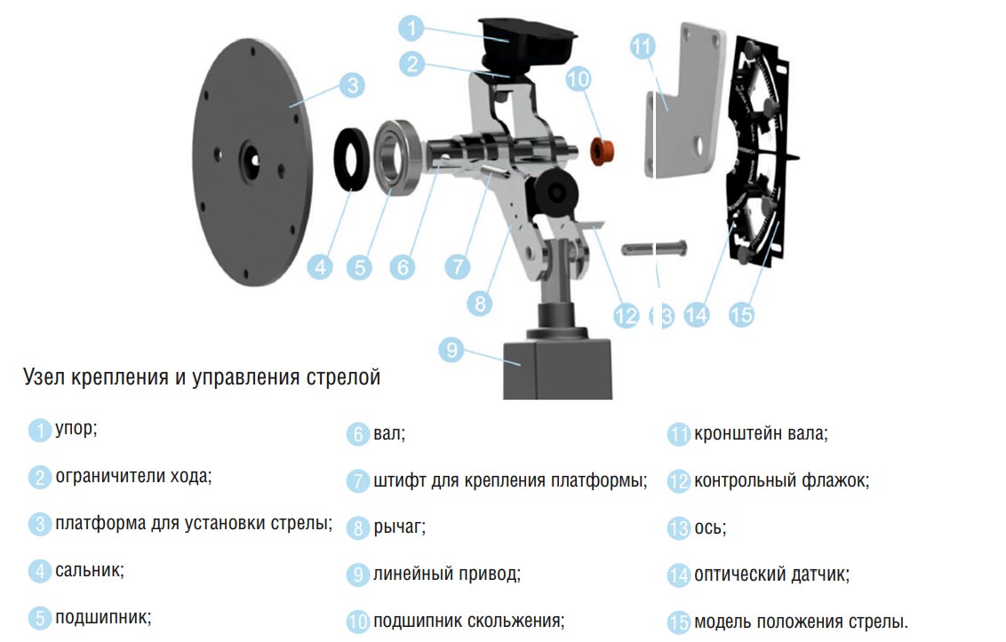 Механизм узла предназначен для преобразования поступательного движения линейного привода во вращательное движение стрелы.