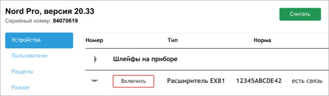 - Нажмите кнопку «Включить», чтобы получить доступ к настройке подключенных шлейфов. Охранные извещатели подключаются ко всем шлейфам. Пожарные извещатели подключаются только к шлейфам 7 и 8 расширителя.