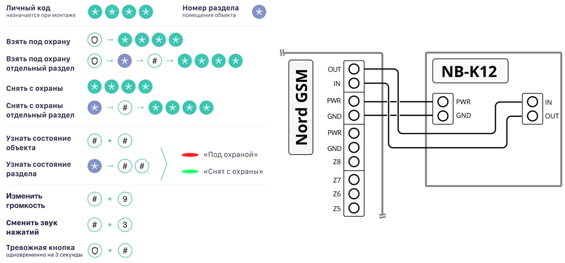 Клавиатура получает питание от основной панели по четырёхпроводной линии связи и обеспечивает надёжную передачу команд и индикацию при минимальном энергопотреблении. Устройство рассчитано на длительный срок службы и устойчиво к перепадам температуры, что делает его пригодным как для жилых помещений, так и для коммерческих объектов. Благодаря простоте монтажа и лаконичному дизайну NB-K12 легко интегрируется в существующую систему охраны Nord GSM/WRL.