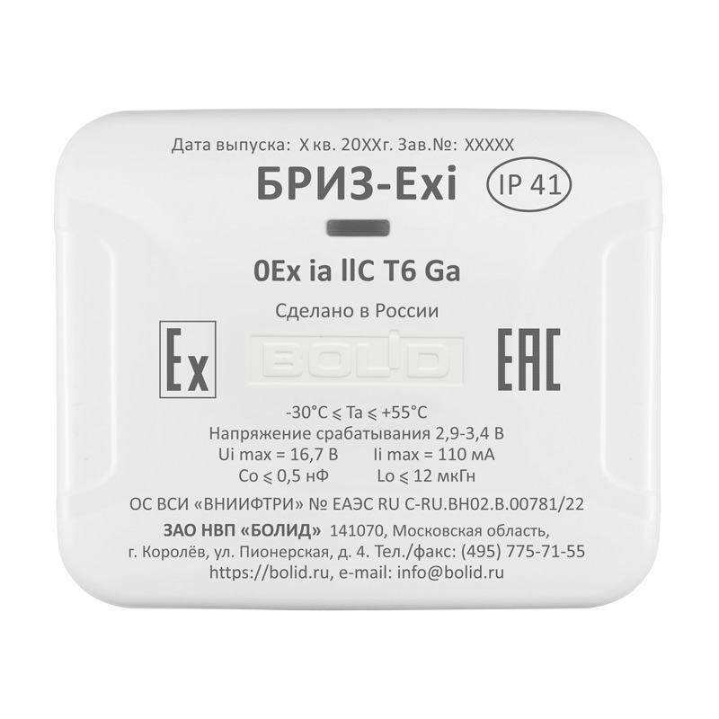 БРИЗ-Exi — это специализированный взрывозащищённый блок разветвительно-изолирующего типа, предназначенный для эксплуатации во взрывоопасных помещениях. Он устанавливается в искробезопасную двухпроводную линию связи контроллеров «С2000-КДЛ» и автоматически изолирует участок при коротком замыкании, восстанавливая связь после устранения неисправности. Конструкция блока обеспечивает класс взрывозащиты «ia» для газовых смесей группы IIC при температурном классе T6, что подтверждается маркировкой 0Ex ia IIC T6 Ga. Внутри корпуса применены стабилитроны для ограничения входного напряжения, лакокрасочное покрытие и компаундинг, обеспечивающие требуемые электрические зазоры и устойчивость к внешним воздействиям.