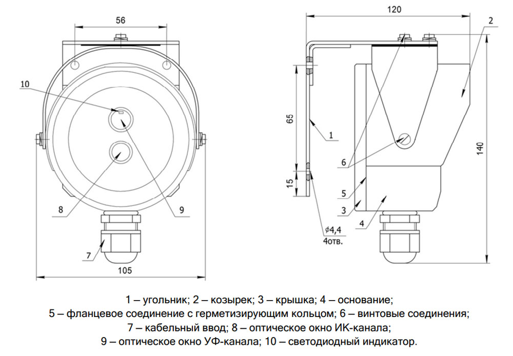 Конструкция предусматривает разборный корпус с фланцевым герметизирующим соединением и регулируемый кронштейн, обеспечивающий юстировку угла обзора по горизонтали и вертикали. Монтаж осуществляется на жёсткой поверхности с помощью четырёх точек крепления, а для защиты от электромагнитных помех рекомендуется использование экранированных витых пар. Извещатель оснащён интерфейсом RS‑485 (Modbus RTU) для интеграции в централизованные системы, а оптронные выходы «Ш1» и «Ш2» позволяют передавать извещения «Пожар» и «Неисправность» в приёмно‑контрольные приборы.
