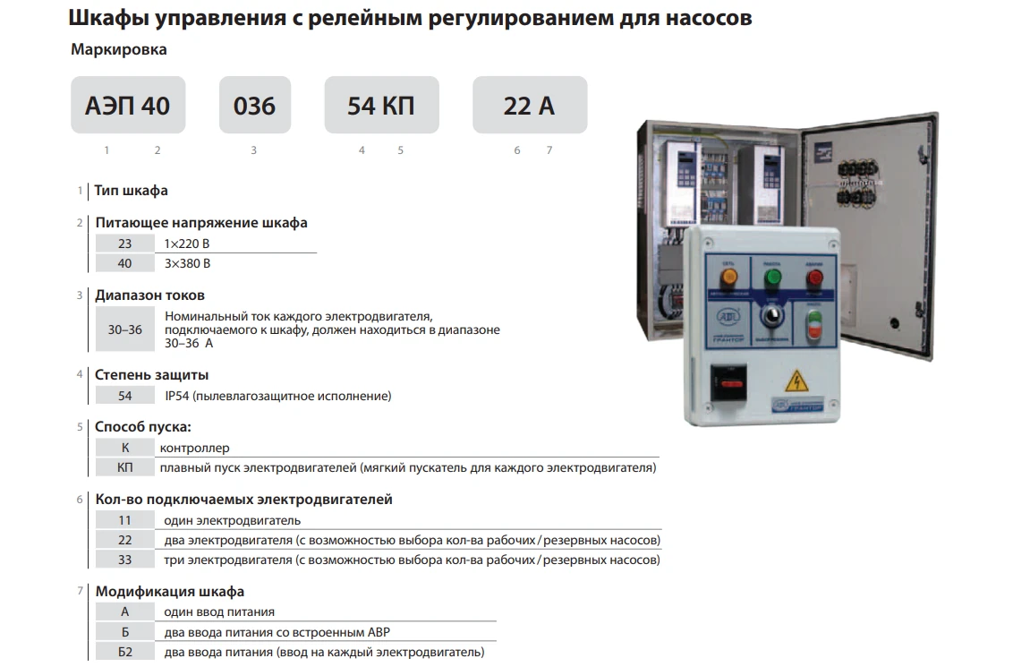 Во всех шкафах серии реализована логика управления двумя насосами по принципу «переменного мастера» — агрегаты поочередно выполняют роль рабочего насоса с автоматическим выравниванием моторесурса. Реализованы режимы «Ручной» и «Автоматический», индикация состояния питания, работы и аварий насосов, а также аппаратная защита от перегрузок по току, перегрева, короткого замыкания и нарушений параметров питающей сети. Корпус IP54 допускает установку в технических помещениях. Модель АЭП40-001-54КП-22Б2 относится к младшим модификациям серии и сохраняет все функции плавного пуска при компактных габаритах.