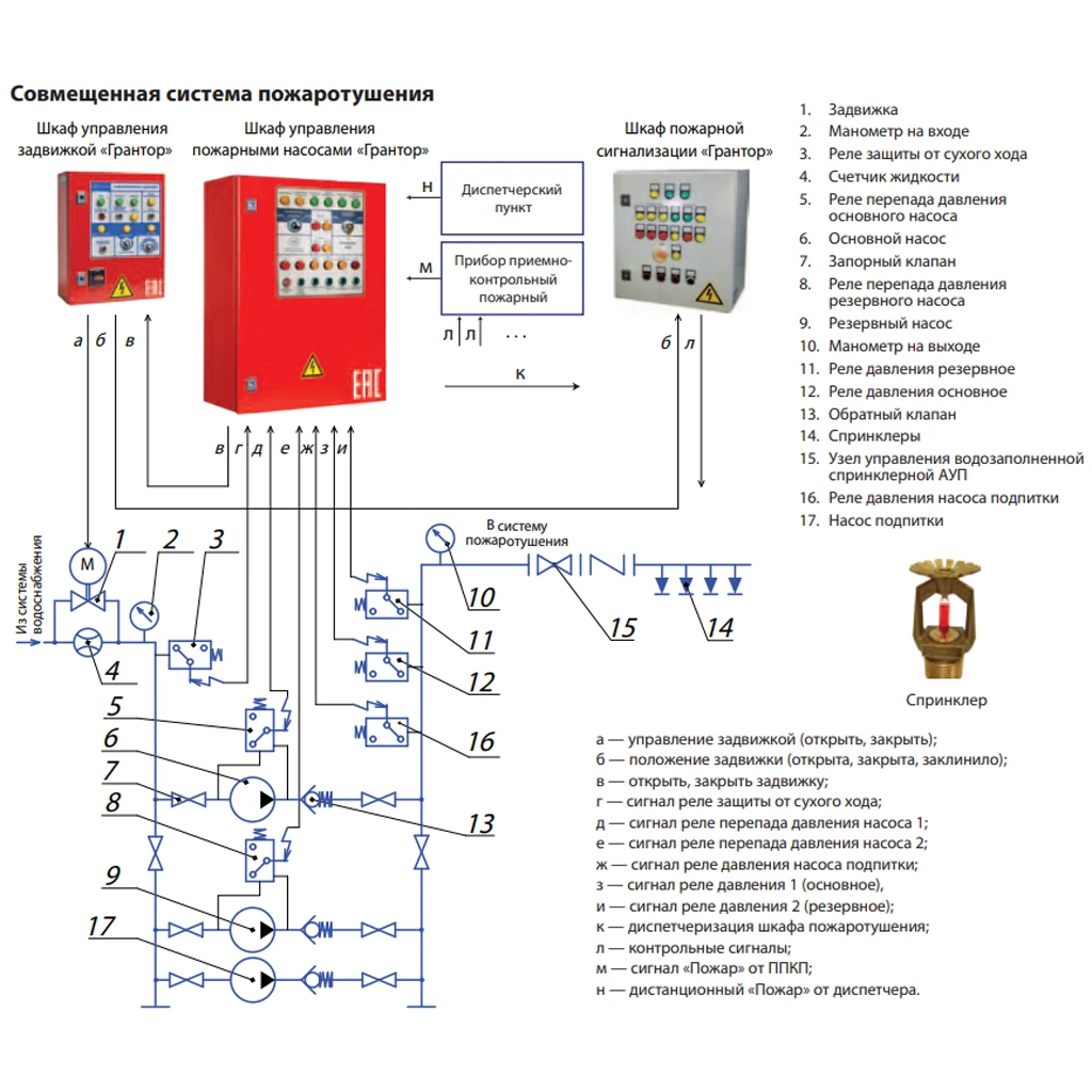 - Выходные сигналы: «Работа/Авария» каждого насоса, питание на каждом вводе, режим «Пожар», «Общая неисправность», «Блокировка/Автоматика отключена», управление задвижкой «Открыть/Закрыть»