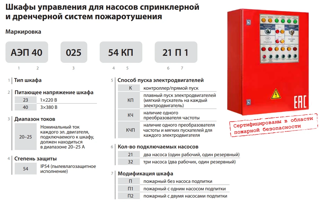 Корпус шкафа выполнен в навесном металлическом исполнении со степенью защиты IP54 и нижними кабельными вводами. В комплект входят ключи для защиты от несанкционированного доступа к органам управления и индикации. Модификация АЭП40-003-54КП-21П1 соответствует требованиям ГОСТ Р 53325-2012 и предназначена для эксплуатации в составе пожарных насосных станций и инженерных систем зданий, где требуется высокая надёжность и устойчивость к аварийным режимам.